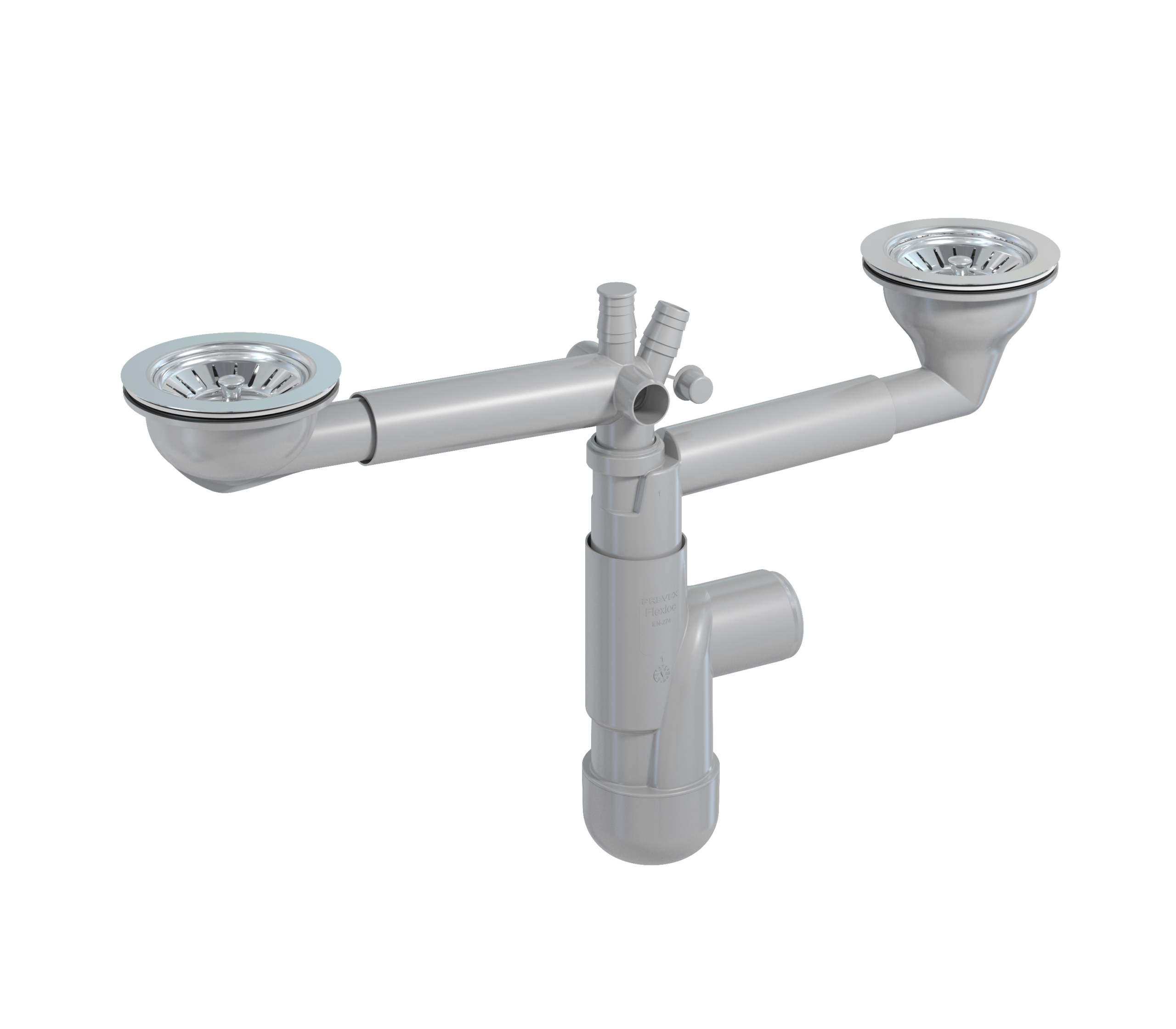 Flexloc 2-bowl, strainers 114 mm with two different lengths of screws. Outlet 40/50 mm. Connections for dish washer and overflows.