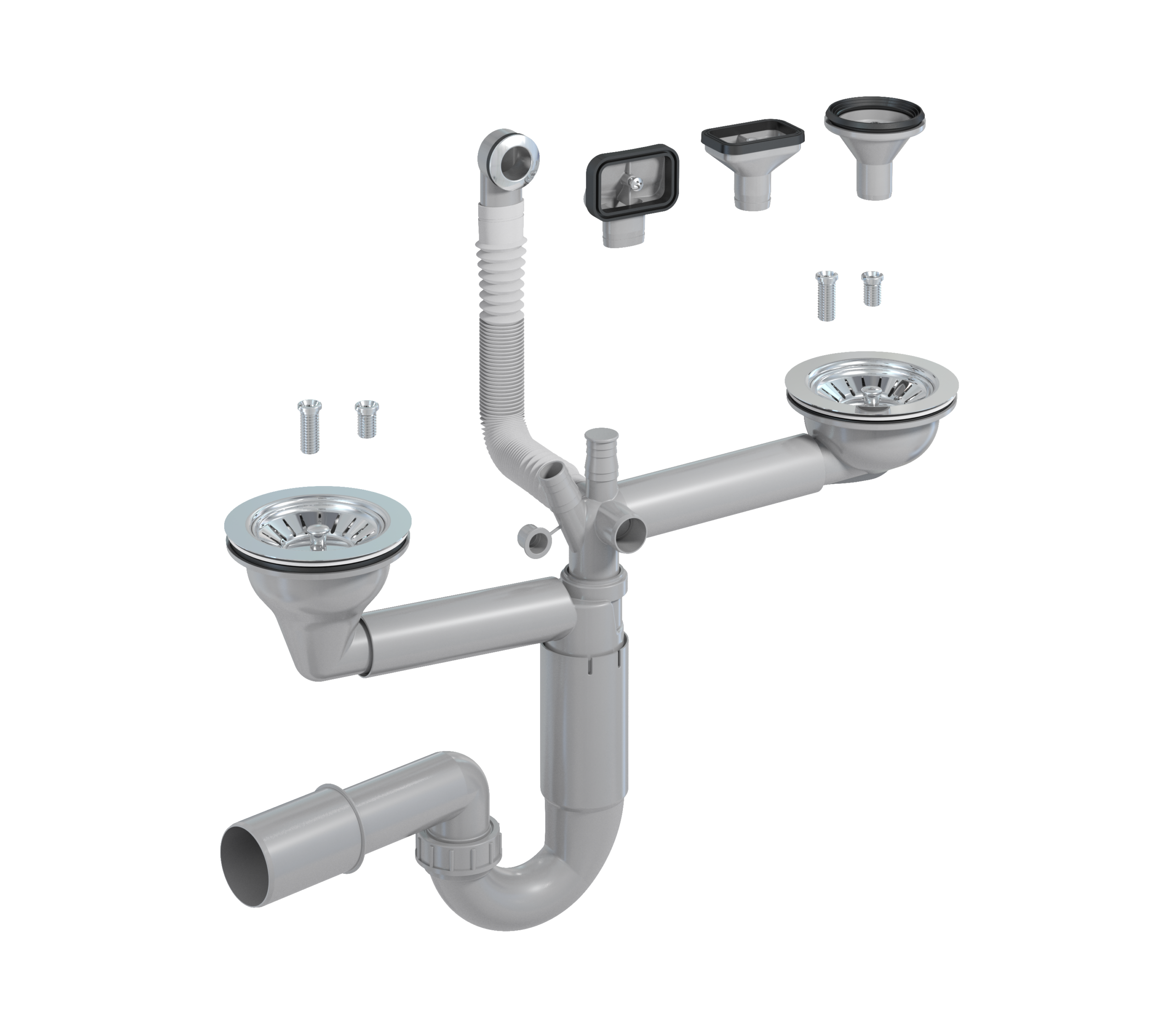 P-loc 2-bowl, 114 mm strainers. Connections for dish washer. Flexible overflow pipe 180-570 mm with four different shapes of overflows. Two lengths of screws included. Outlet pipe Ø 40/50 mm for drain connection.